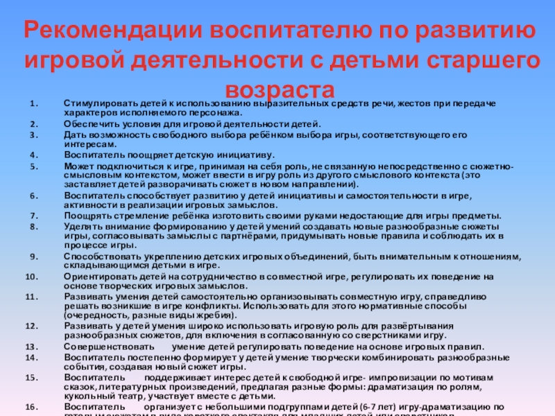 Рекомендации воспитателю по развитию игровой деятельности с детьми старшего возраста