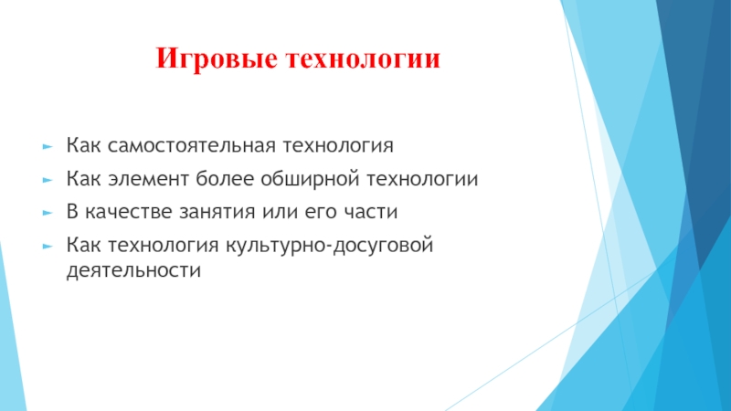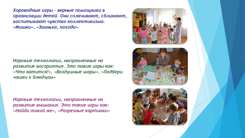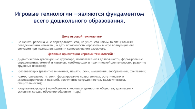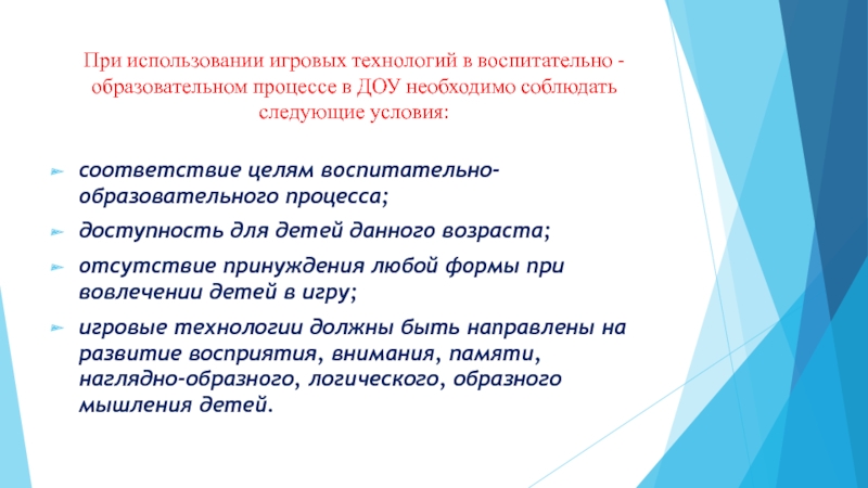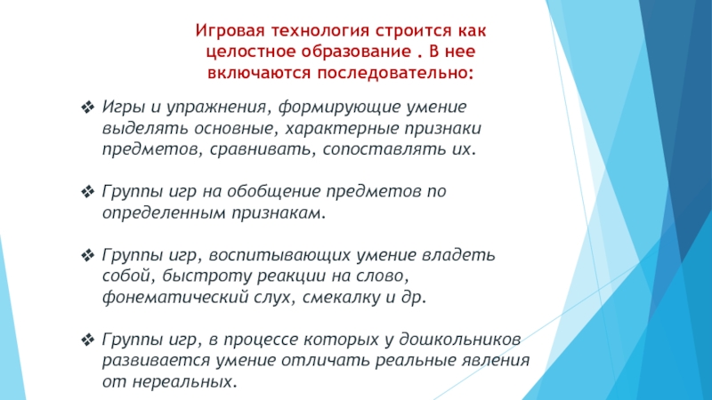 игровые технологии должны быть направлены на развитие восприятия, внимания, памяти, наглядно-образного, логического, образного мышления детей.