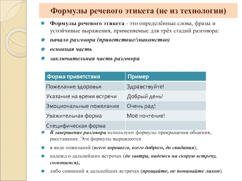 В завершение разговора используют формулы прекращения общения, расставания. Эти формулы выражаются