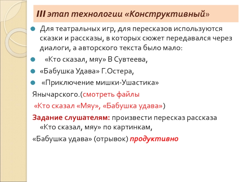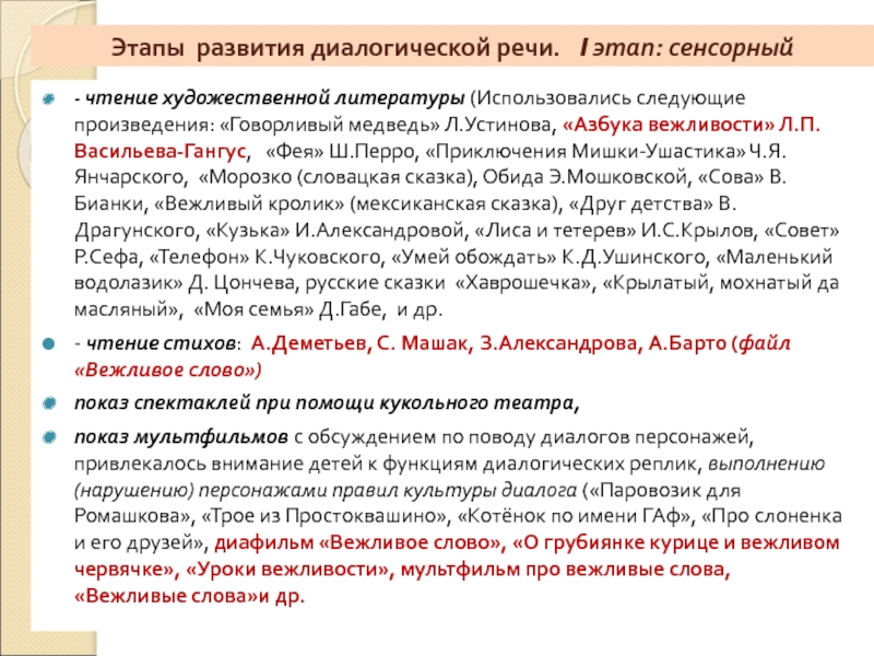 (Использовались следующие произведения: «Говорливый медведь» Л.Устинова, «Азбука вежливости» Л.П. Васильева-Гангус, «Фея» Ш.Перро, «Приключения Мишки-Ушастика» Ч.Я. Янчарского, «Морозко (словацкая сказка), Обида Э.Мошковской, «Сова» В.Бианки, «Вежливый кролик» (мексиканская сказка), «Друг детства» В.Драгунского, «Кузька» И.Александровой, «Лиса и тетерев» И.С.Крылов, «Совет» Р.Сефа, «Телефон» К.Чуковского, «Умей обождать» К.Д.Ушинского, «Маленький водолазик» Д. Цончева, русские сказки «Хаврошечка», «Крылатый, мохнатый да масляный», «Моя семья» Д.Габе, и др.