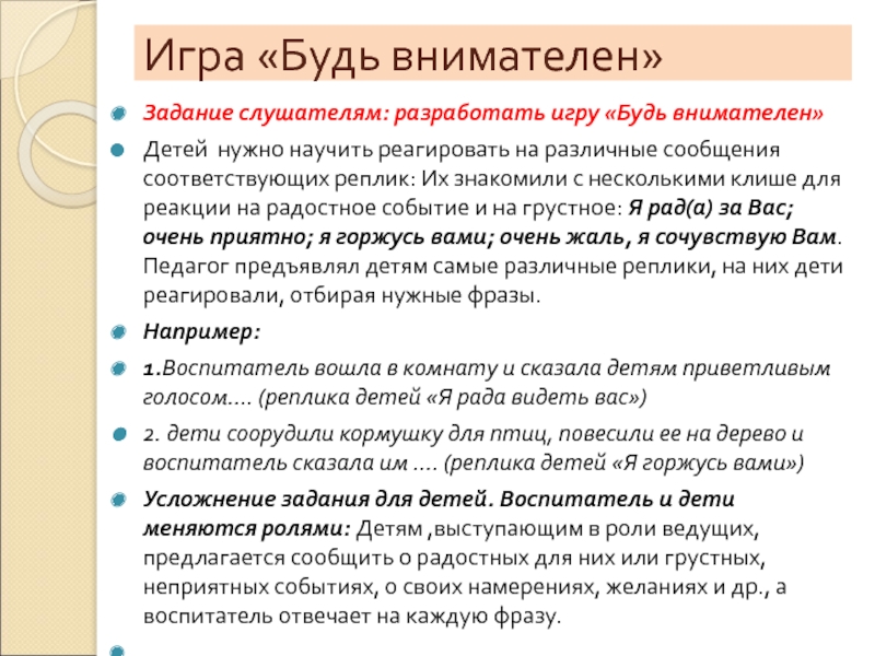 Задание слушателям: «Ваше название игры придумать и ее сценарий