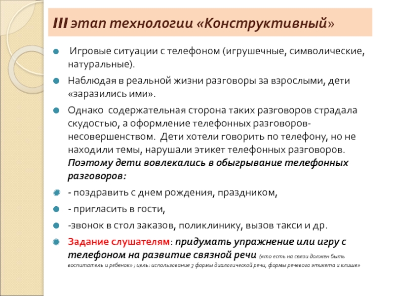 Задание слушателям: придумать упражнение или игру с телефоном на развитие связной речи («то есть на связи должен быть воспитатель и ребенок» ; цель: использование 3 формы диалогической речи, формы речевого этикета и клише»