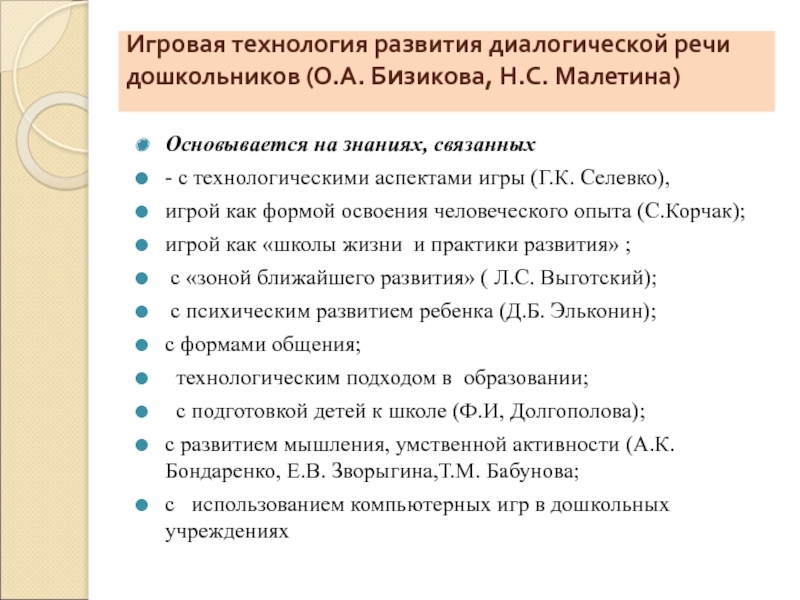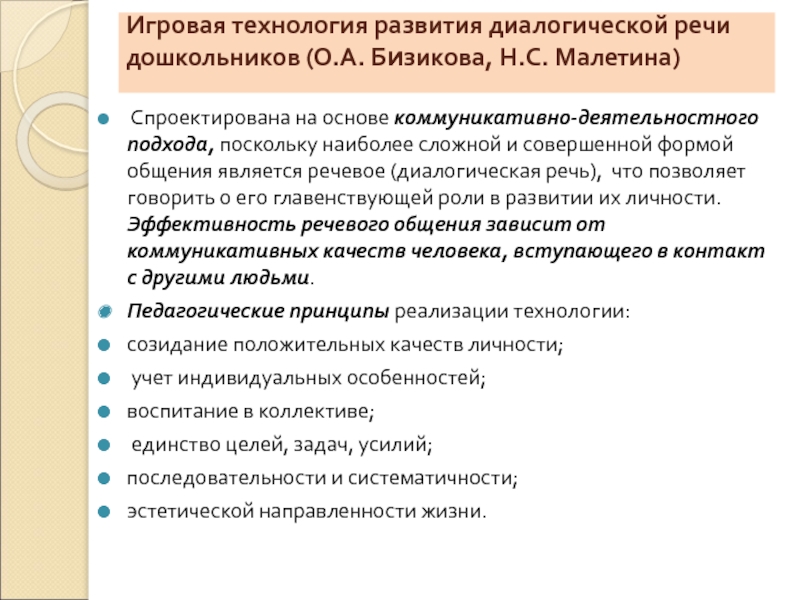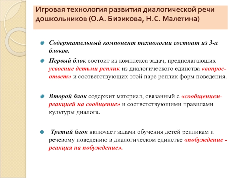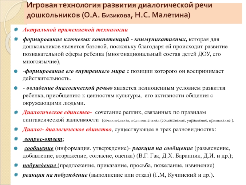 Игровая технология развития диалогической речи дошкольников (О.А. Бизикова, Н.С. Малетина)