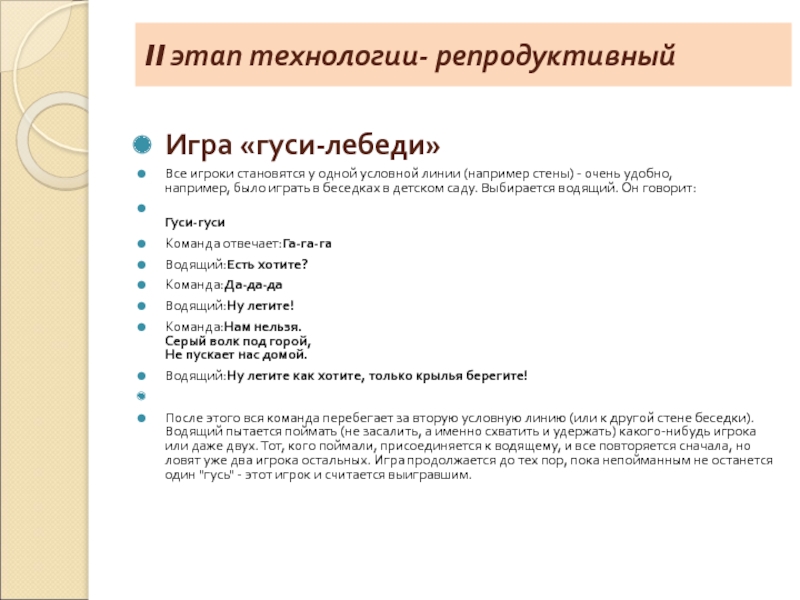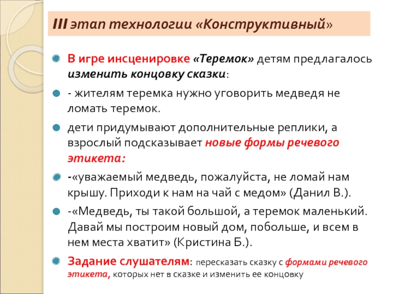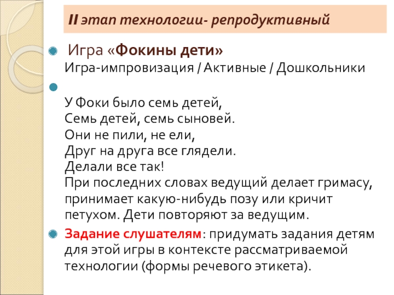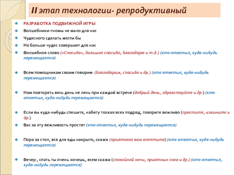 -организация многократного повторения формул речевого этикета в словесных играх «Справочное бюро» (роль справочного бюро- ребенок), «Вежливые поиски», в настольно-печатных играх «Гуси-лебеди», «Пряничная избушка» и др.; (задание слушателям - разработать игру: «Справочное бюро» Вначале может быть роль выполнит воспитатель)