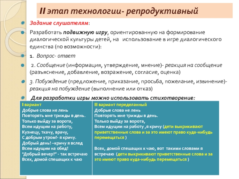 Слайд 11Этикетные средства к диалогическому единству «Побуждение- реакция на побуждение».