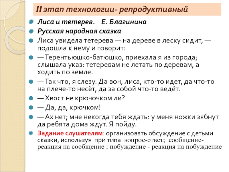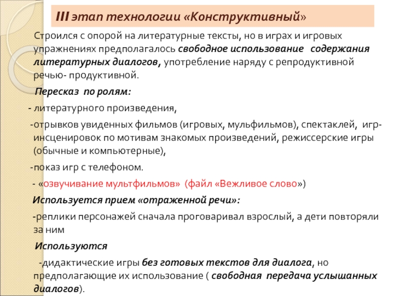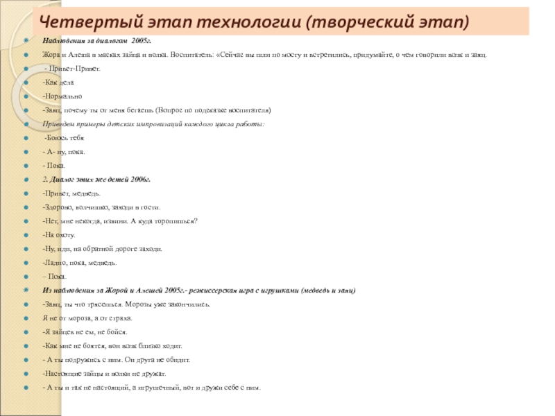 - воспроизведение литературных диалогов: чтение стихотворений по ролям, разыгрывание этюдов по готовым текстам, подвижные и словесные игры с диалогами, разучивание и разыгрывание по ролям коротких стихов и народных стихов-прибауток давало возможность детям осваивать не только формы диалогических реплик, вопросительную, повествовательную и побудительную интонацию, но и приучало выполнять основные правила диалога: очередность, поддержание и развитие темы разговора и др.