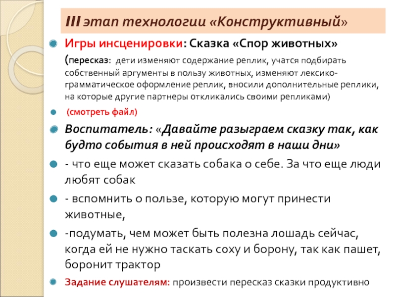 После усвоения инициативных реплик задача менялась: «Эхо начинало учиться отвечать на просьбы, советы, предложения, приглашения». Правила игры изменились: дети бросали мяч педагогу, и он озвучивал различные варианты реакций на побуждения. Затем менялись ролями. В этой технологии нужно стремиться, чтобы дети не только услышали, но и многократно повторяли некоторые формулы, чтобы они стали привычным средством речевого общения. (задание слушателям - разработать игру по определенной теме)