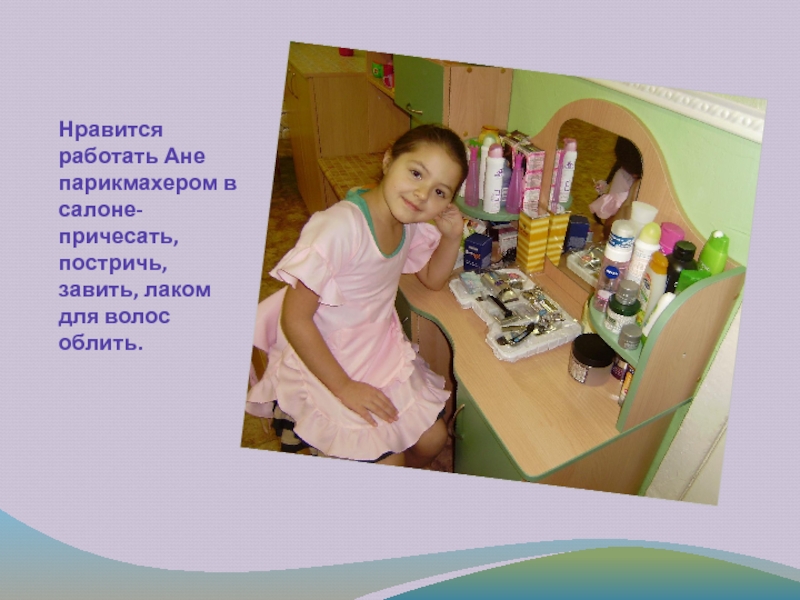 Слайд 15Нравится работать Ане парикмахером в салоне- причесать, постричь, завить, лаком для