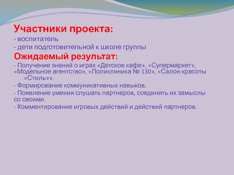 - Появление умения слушать партнеров, соединять их замыслы со своими.