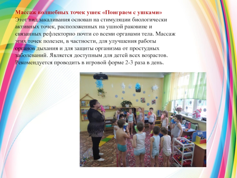 Слайд 8Массаж волшебных точек ушек «Поиграем с ушками» Этот вид закаливания основан