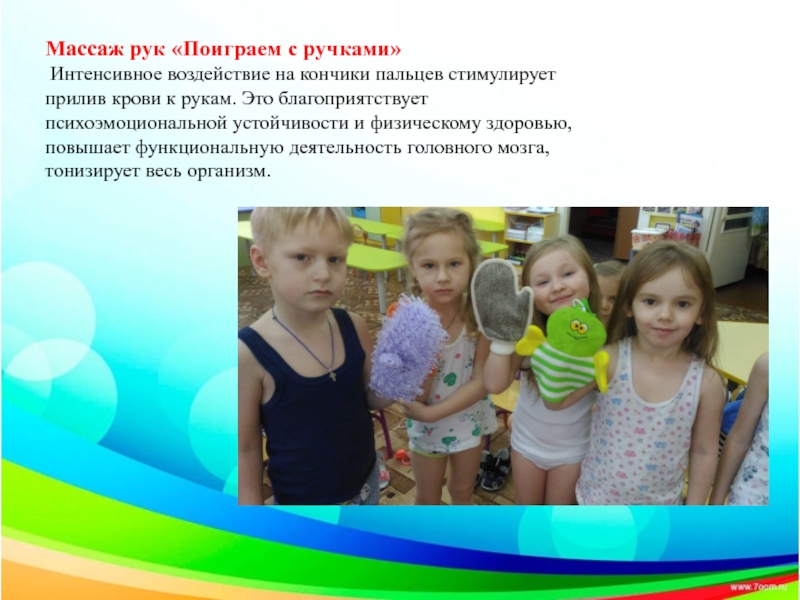 Массаж рук «Поиграем с ручками» Интенсивное воздействие на кончики пальцев стимулирует прилив крови к рукам. Это благоприятствует