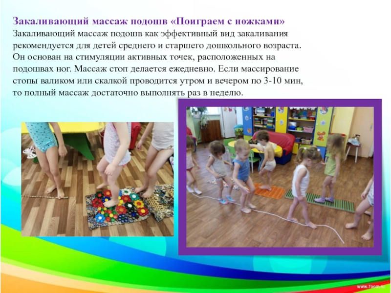 Слайд 9Закаливающий массаж подошв «Поиграем с ножками» Закаливающий массаж подошв как эффективный