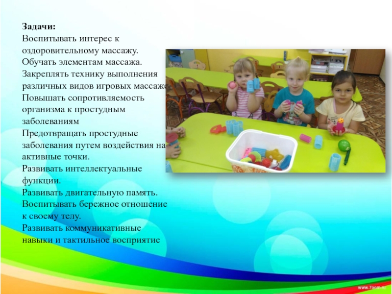 Задачи:Воспитывать интерес к оздоровительному массажу.Обучать элементам массажа.Закреплять технику выполнения различных видов игровых массажейПовышать сопротивляемость организма к простудным