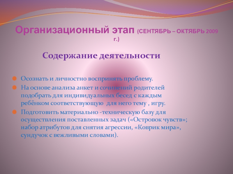Слайд 6Организационный этап (СЕНТЯБРЬ – ОКТЯБРЬ 2009 г.)
