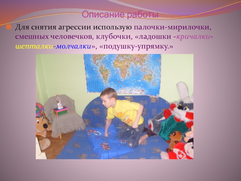 Для снятия агрессии использую палочки-мирилочки, смешных человечков, клубочки, «ладошки -кричалки-шепталки-молчалки»,