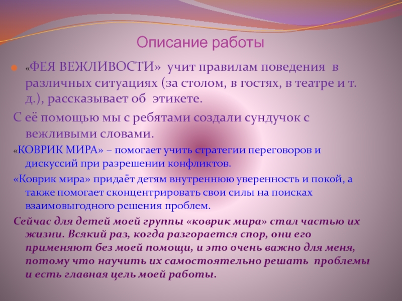 «Коврик мира» придаёт детям внутреннюю уверенность и покой, а также помогает сконцентрировать свои силы на поисках взаимовыгодного решения проблем.
