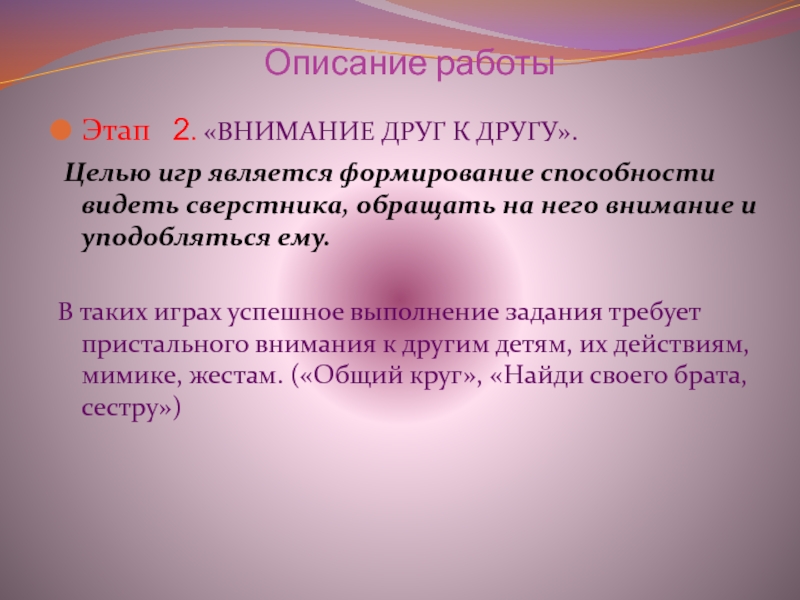 В таких играх успешное выполнение задания требует пристального внимания к другим детям, их действиям, мимике, жестам. («Общий круг», «Найди своего брата, сестру»)