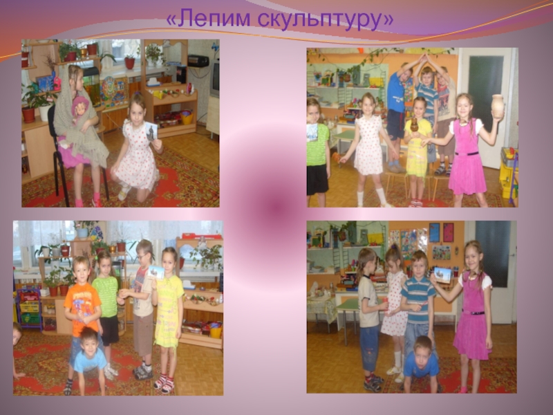 Игра «Лепим скульптуру»: выбирается скульптор, который по фото из глины, а глина мягкий, послушный материал лепит скульптуру. На фото дети лепили скульптуры родного города. может участвовать группа детей в творческом процессе, а может пара. Главное условие не разговаривать во время творческого процесса.