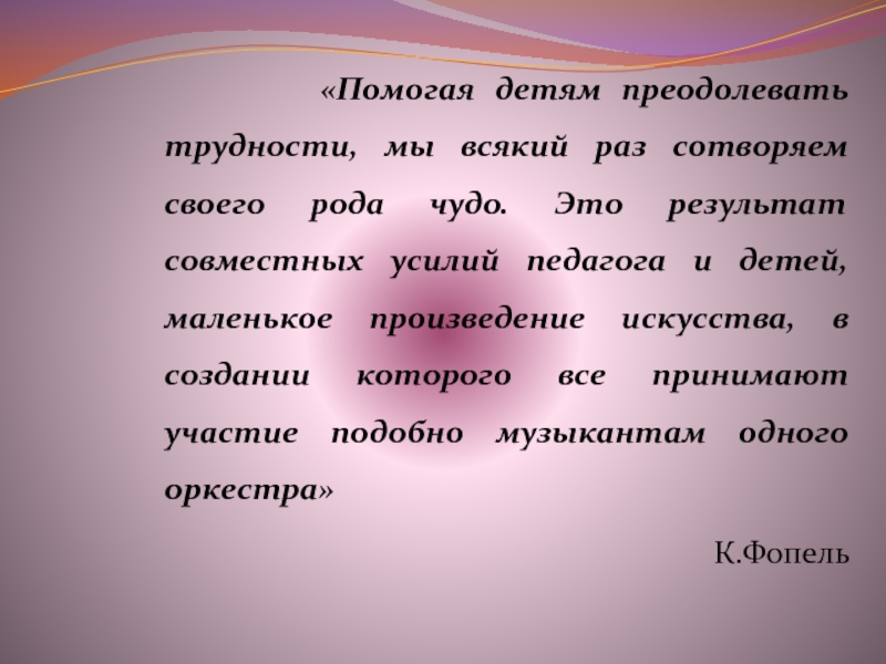 раз сотворяем своего рода чудо. Это результат совместных усилий педагога и детей, маленькое произведение искусства, в создании которого все принимают участие подобно музыкантам одного оркестра»