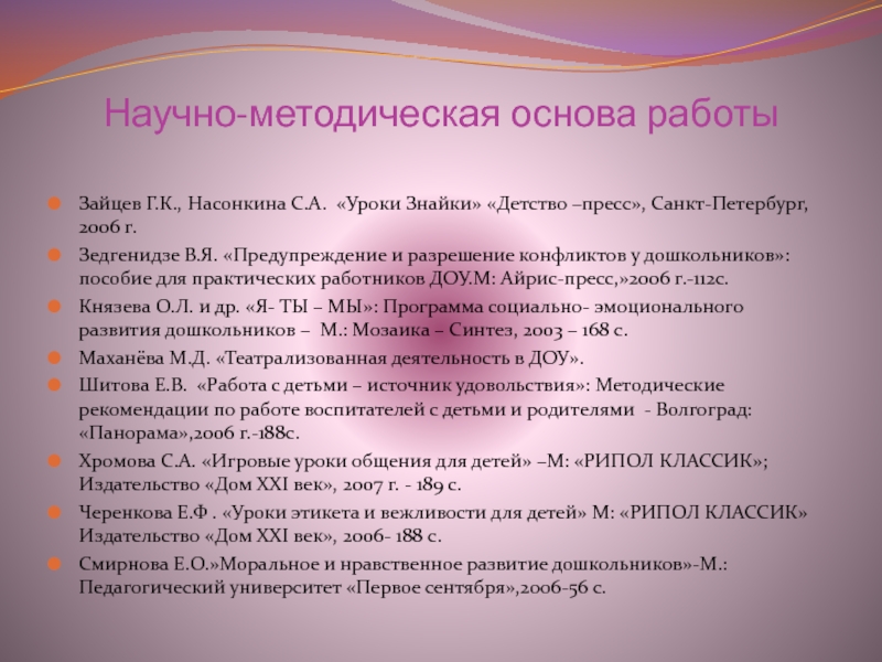 Зедгенидзе В.Я. «Предупреждение и разрешение конфликтов у дошкольников»: пособие для практических работников ДОУ.М: Айрис-пресс,»2006 г.-112с.