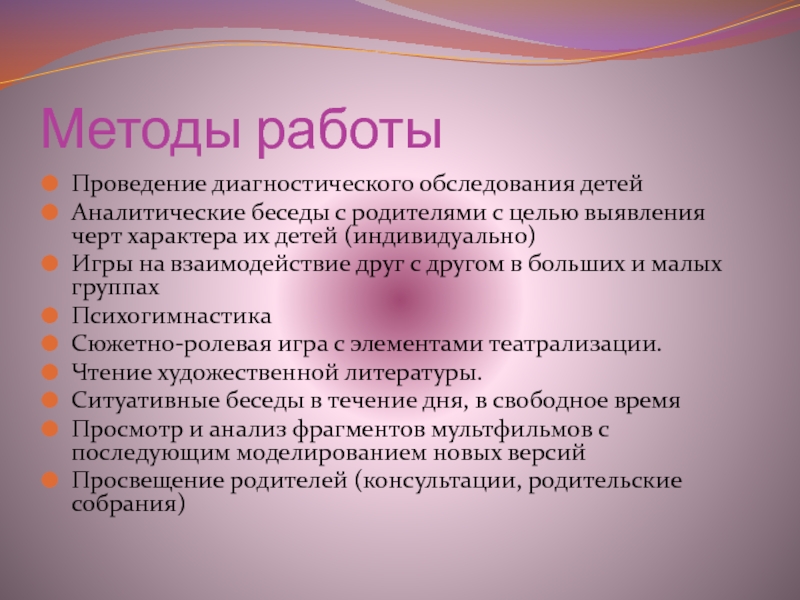 «Общение детей с детьми». Где рассказала о важности проблемы взаимоотношений детей между собой. Родители написали сочинение «Характер моего ребёнка», затем индивидуально провела беседу о каждом ребёнке. Родители видя такую работу, непроизвольно начинают задумываться, что происходит с ребёнком, о своих взаимоотношениях с детьми. В ходе бесед , наблюдений, перед нами более глубоко раскрылись черты характера детей . Которые не всегда заметны в повседневной жизни, когда мы заняты повседневными делами, это понимание и позволило составить план работы.
