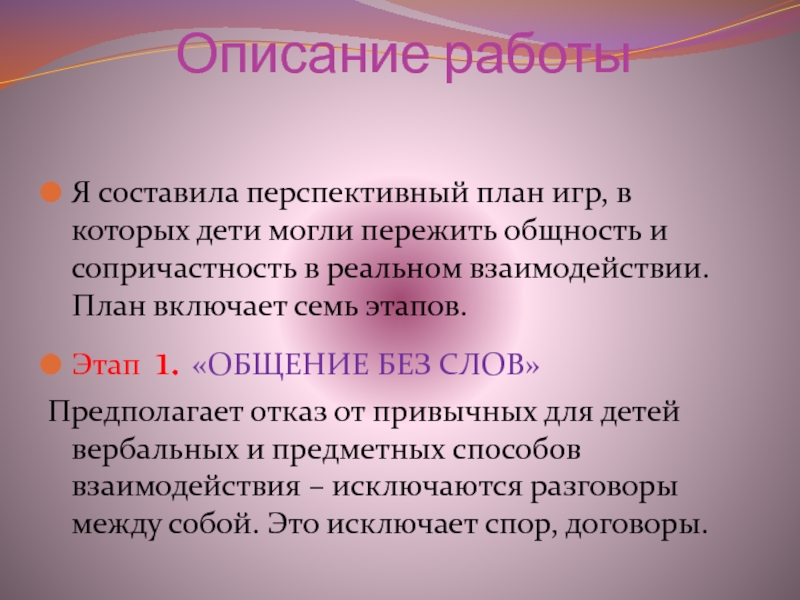Предполагает отказ от привычных для детей вербальных и предметных способов взаимодействия – исключаются разговоры между собой. Это исключает спор, договоры.