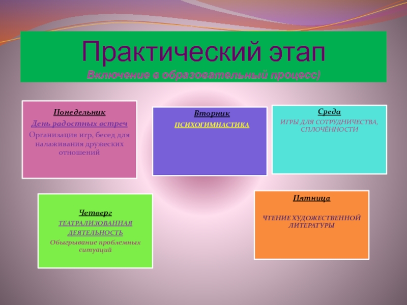 «День радостных встреч» по понедельникам,» Психогимнастика» по вторникам,» Сладкий вечер» по средам, «Театрализованная деятельность» по четвергам, чтение художественной литературы. Я решила, что удобнее будет проводить эту работу в эти моменты, чтобы не перегружать детей. Кто работает по программе «Радуга», тот понимает о чём я говорю.