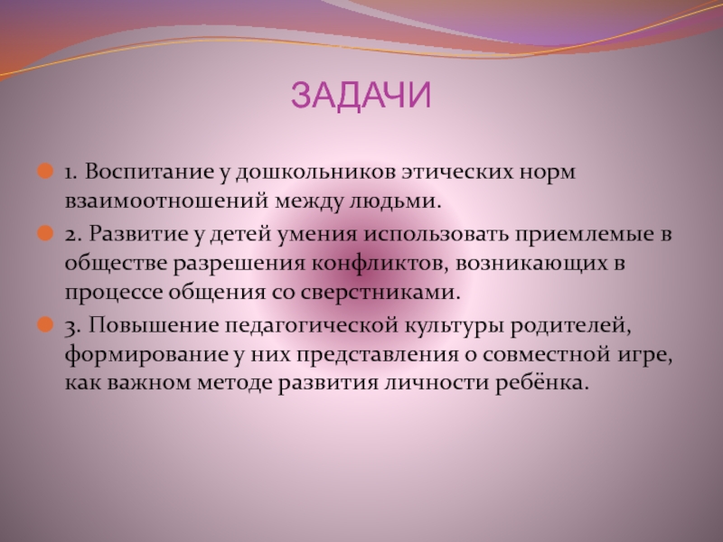 3. Повышение педагогической культуры родителей, формирование у них представления о совместной игре, как важном методе развития личности ребёнка.