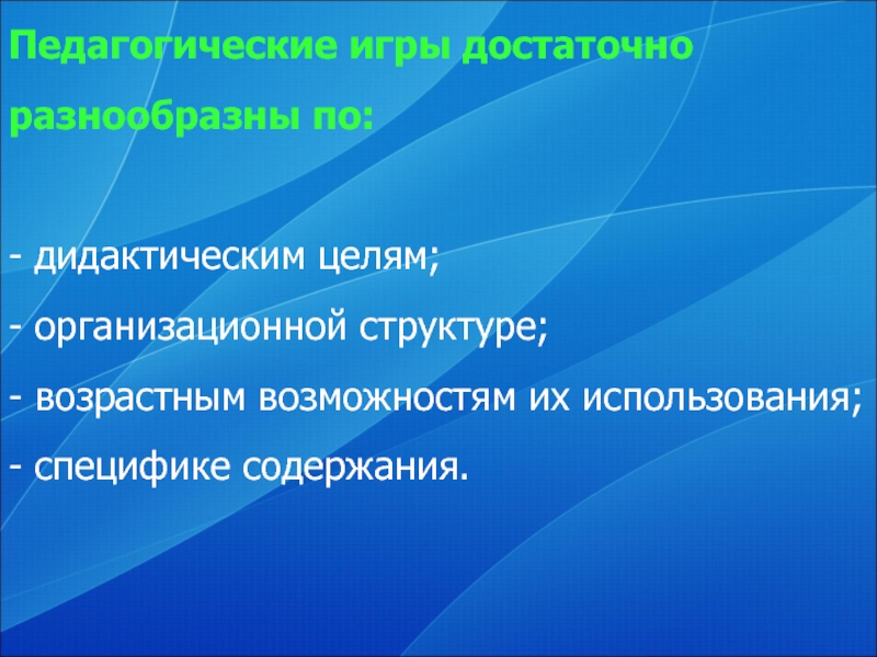 Слайд 4Педагогические игры достаточно разнообразны по: