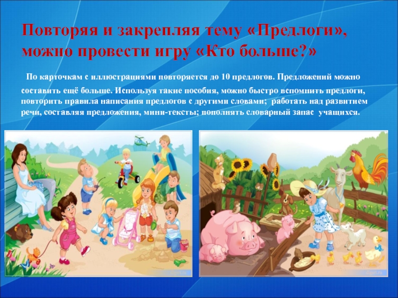 карточкам с иллюстрациями повторяется до 10 предлогов. Предложений можно составить ещё больше. Используя такие пособия, можно быстро вспомнить предлоги, повторить правила написания предлогов с другими словами; работать над развитием речи, составляя предложения, мини-тексты; пополнять словарный запас учащихся.
