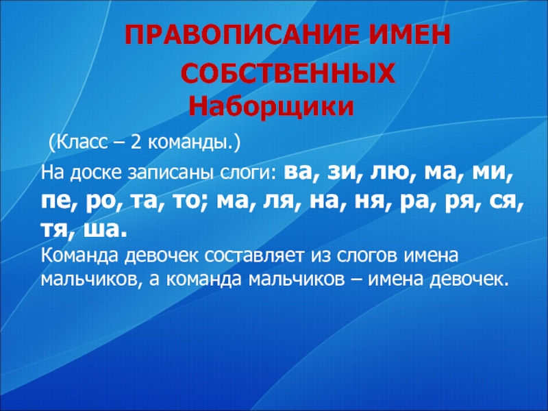 Команда девочек составляет из слогов имена мальчиков, а команда мальчиков – имена девочек.