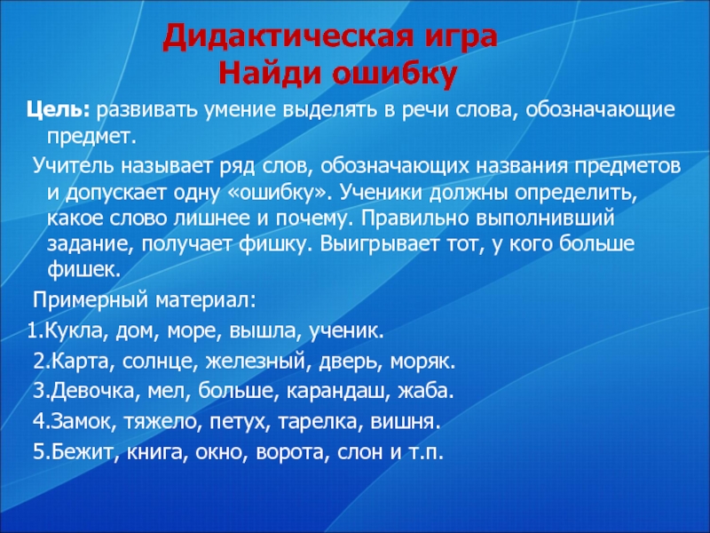 Учитель называет ряд слов, обозначающих названия предметов и допускает одну «ошибку». Ученики должны определить, какое слово лишнее и почему. Правильно выполнивший задание, получает фишку. Выигрывает тот, у кого больше фишек.