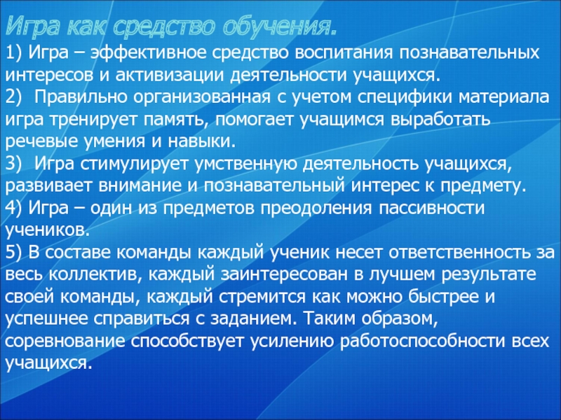 4) Игра – один из предметов преодоления пассивности учеников.