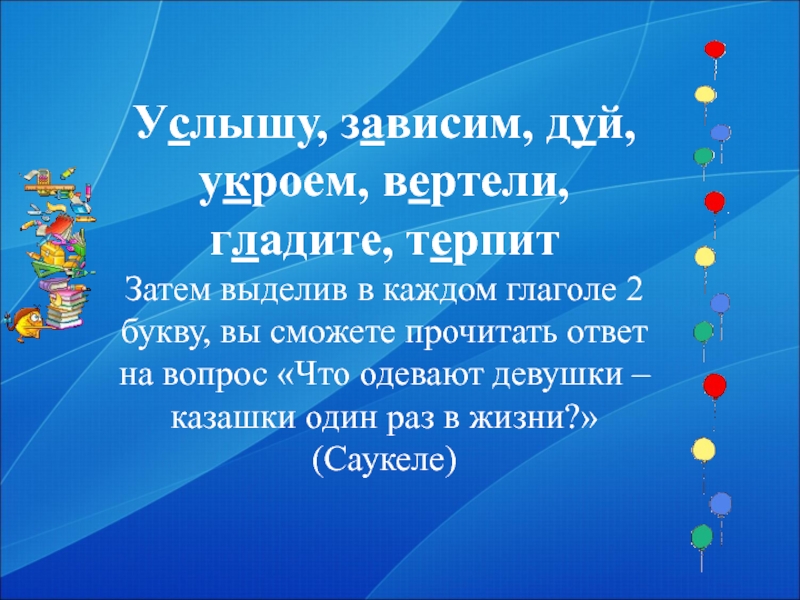 Слайд 23Услышу, зависим, дуй, укроем, вертели, гладите, терпит