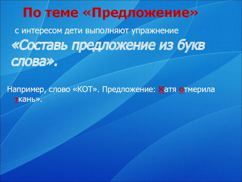 Слайд 17Например, слово «КОТ». Предложение: Катя отмерила ткань».