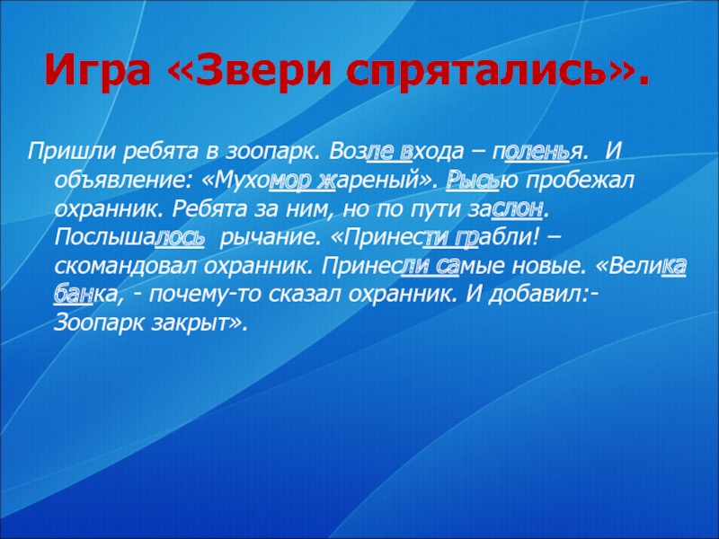 Дается на доске текст. Дети должны найти в