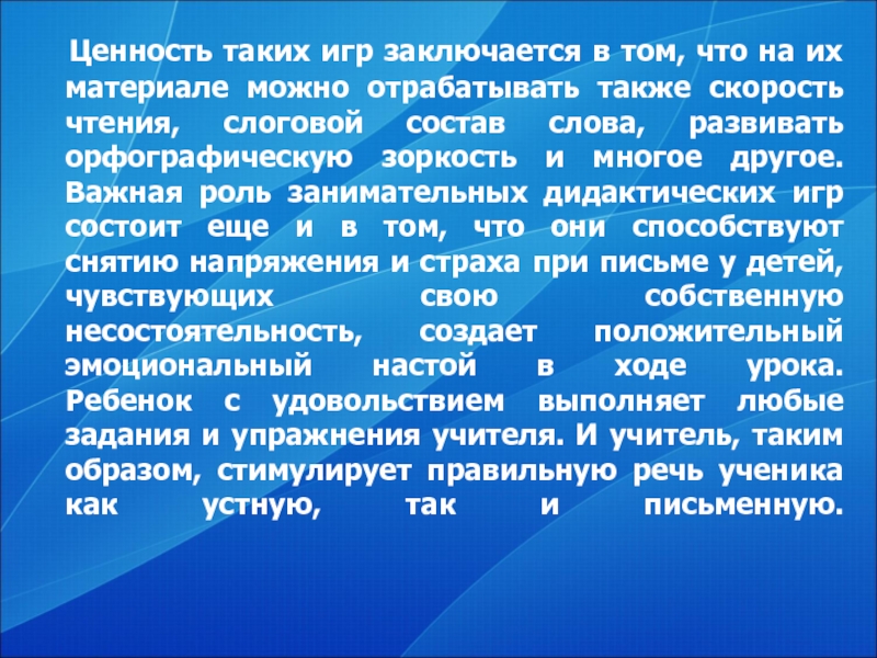 Важная роль занимательных дидактических игр состоит еще и в том, что они способствуют снятию напряжения и страха при письме у детей, чувствующих свою собственную несостоятельность, создает положительный эмоциональный настой в ходе урока.