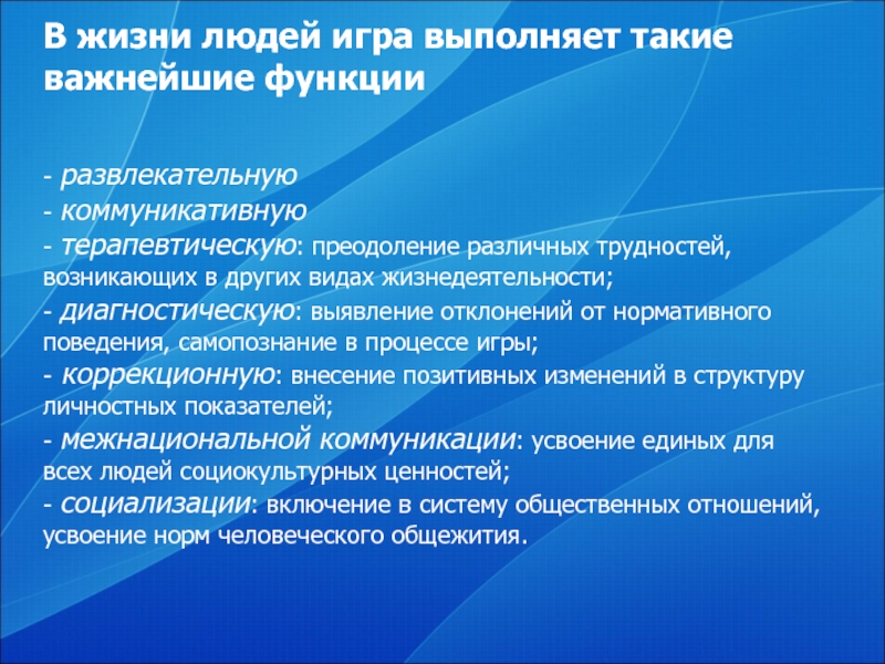 Слайд 2В жизни людей игра выполняет такие важнейшие функции
