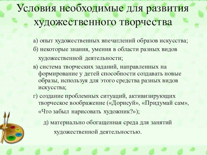 г) создание проблемных ситуаций, активизирующих творческое воображение («Дорисуй», «Придумай сам», «Что забыл нарисовать художник?»);
