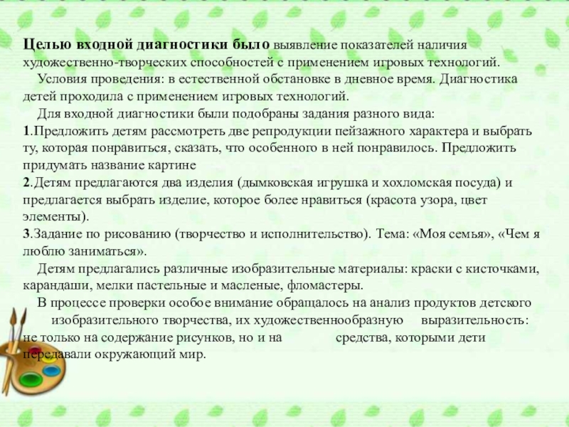 Слайд 16Целью входной диагностики было выявление показателей наличия художественно-творческих способностей с применением