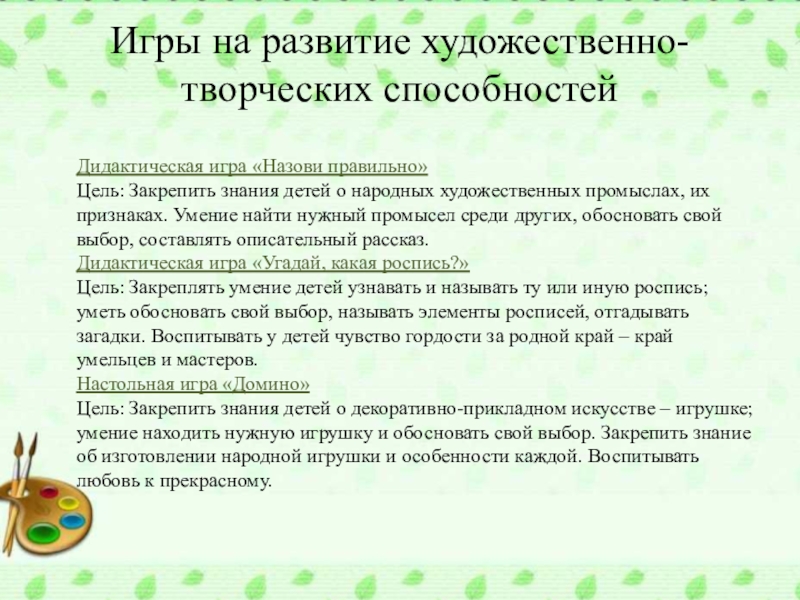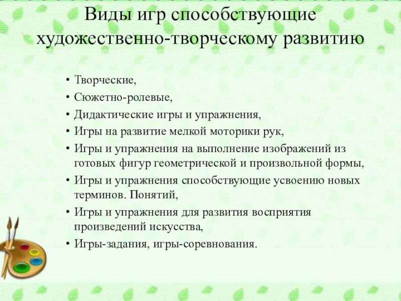 Слайд 10Виды игр способствующие художественно-творческому развитию