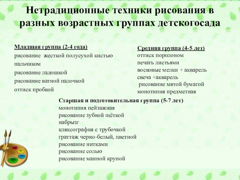 Слайд 8Нетрадиционные техники рисования в разных возрастных группах детскогосада