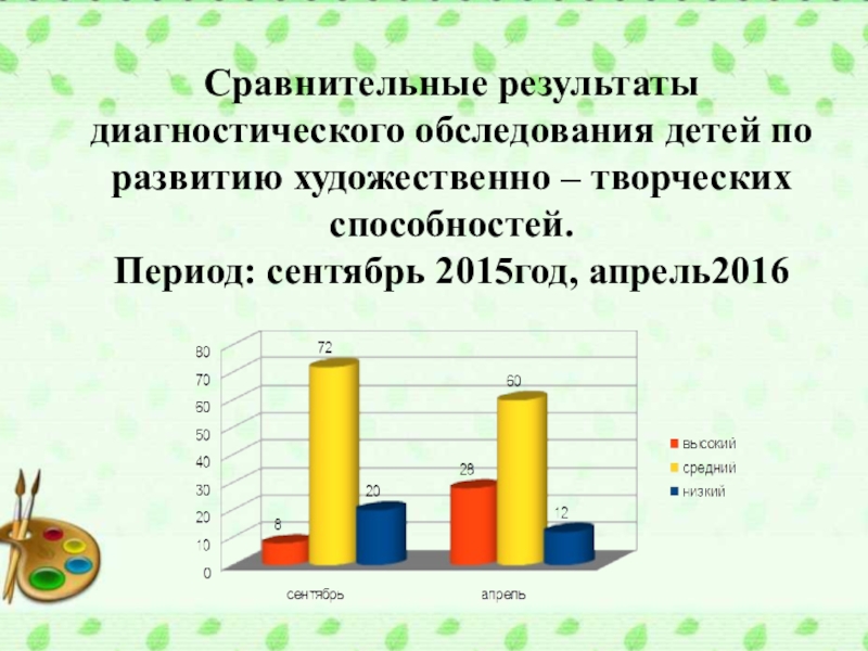 Слайд 19Сравнительные результаты диагностического обследования детей по развитию художественно – творческих способностей.