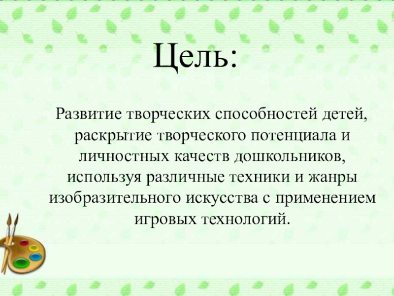 творческого потенциала и личностных качеств дошкольников, используя различные техники и жанры изобразительного искусства с применением игровых технологий.