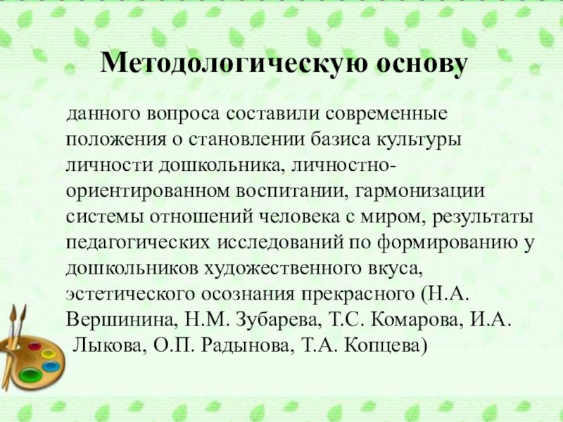 культуры личности дошкольника, личностно-ориентированном воспитании, гармонизации системы отношений человека с миром, результаты педагогических исследований по формированию у дошкольников художественного вкуса, эстетического осознания прекрасного (Н.А. Вершинина, Н.М. Зубарева, Т.С. Комарова, И.А. Лыкова, О.П. Радынова, Т.А. Копцева)