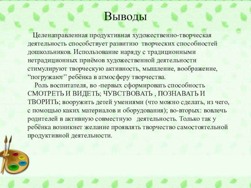 Роль воспитателя, во -первых сформировать способность СМОТРЕТЬ И ВИДЕТЬ; ЧУВСТВОВАТЬ , ПОЗНАВАТЬ И ТВОРИТЬ; вооружить детей умениями (что можно сделать, из чего, с помощью каких материалов и оборудования); во-вторых: вовлечь родителей в активную совместную деятельность. Только так у ребёнка возникнет желание проявлять творчество самостоятельной продуктивной деятельности.