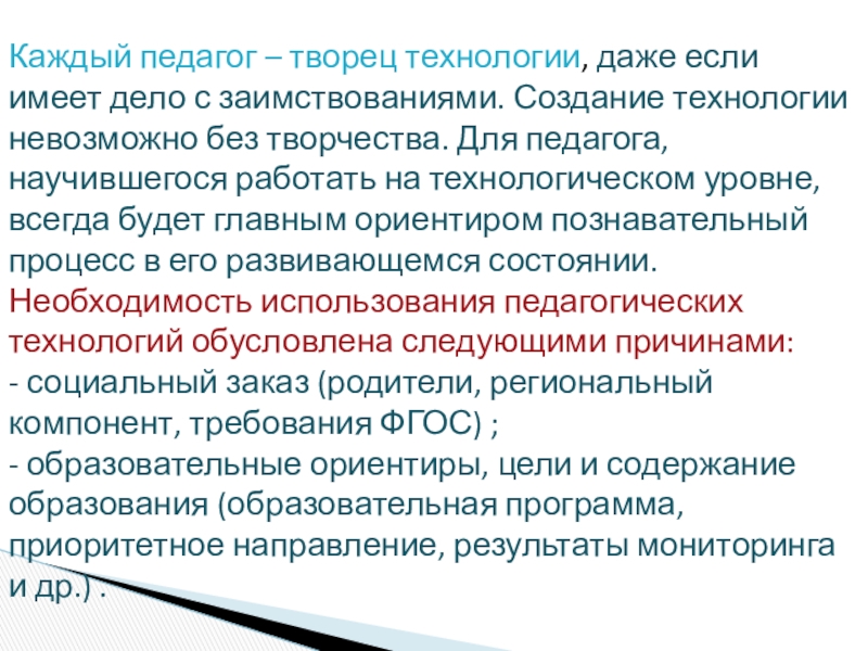 Каждый педагог – творец технологии, даже если имеет дело с заимствованиями. Создание технологии невозможно без творчества. Для педагога, научившегося работать на технологическом уровне, всегда будет главным ориентиром познавательный процесс в его развивающемся состоянии. Необходимость использования педагогических технологий обусловлена следующими причинами: