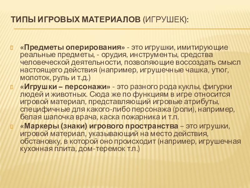 типы игровых материалов (игрушек): «Предметы оперирования» - это игрушки, имитирующие реальные предметы, - орудия, инструменты, средства человеческой деятельности, позволяющие воссоздать смысл настоящего действия (например, игрушечные чашка, утюг, молоток, руль и т.д.)«Игрушки – персонажи» - это разного