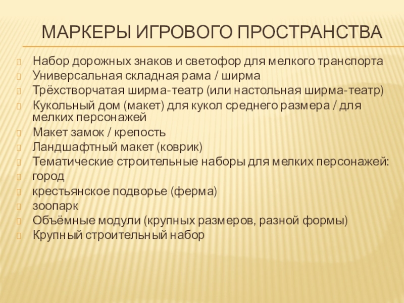 «Маркеры (знаки) игрового пространства – это игрушки, игровой материал, указывающий на место действия, обстановку, в которой оно происходит (например, игрушечная кухонная плита, дом-теремок т.п.)