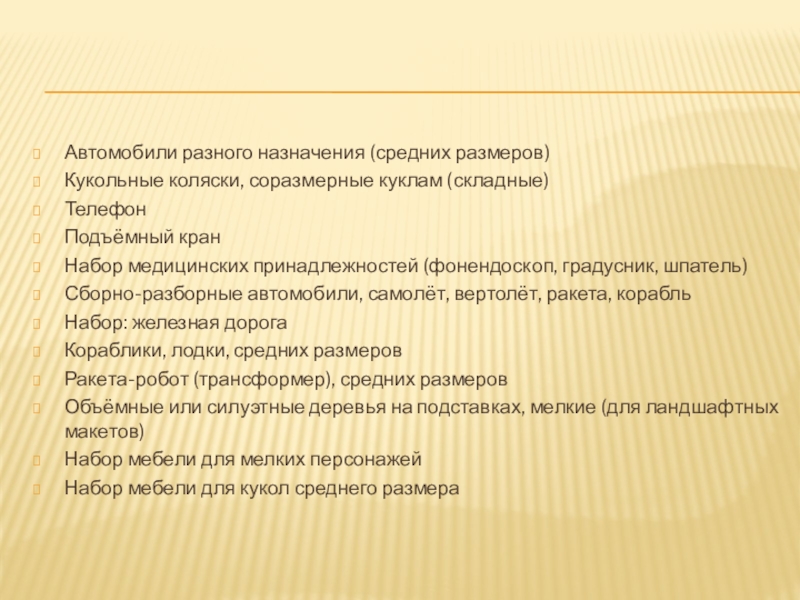 Автомобили разного назначения (средних размеров)Кукольные коляски, соразмерные куклам (складные)ТелефонПодъёмный кранНабор медицинских принадлежностей (фонендоскоп, градусник, шпатель)Сборно-разборные автомобили, самолёт,